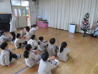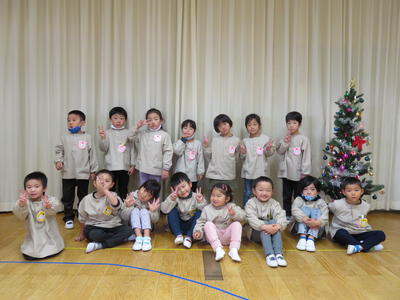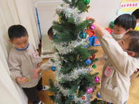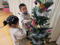 今日から12月です。年少(たんぽぽ組)には、新たにお友達が入園して、8名となり一層元気な声が保育室からこだましています。12月といえばクリスマスです。子どもたちは、クリスマスが来るのをたいへん楽しみにしていますので、遊戯室にみんなで協力しクリスマスツリーを飾りました。点灯式では点灯した瞬間、子どもたちから歓声があがりました。子どもたちにとって、よいクリスマスが訪れますことを切に願っています。