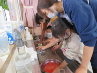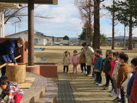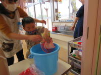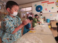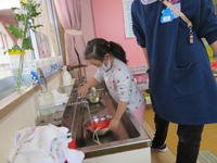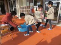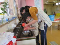 年長(ちゅうりっぷ組)は、明日の餅つき会に使うもち米の米とぎ体験をしました。子どもたちは、とぎ汁が牛乳のように真っ白な水になり驚いていました。また、冷たい水で何回もといだので、手がかじかみ、お家の人が毎日行っているありがたみさが分かったようでした。明日、どのような餅ができるが楽しみですね!