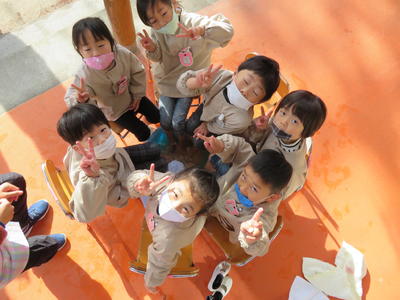 2020年12月7日 16時24分年少(たんぽぽ組)は、クリスマスに飾るサンタクロースを折り紙で作りました。子どもたちは、上手に色紙を折って帽子を被ったサンタの頭の部分を作り、マジックで目や鼻、口を描き入れました。たいへんかわいらしい素敵な笑顔のサンタができ、さっそくクリスマスリースに飾り付けました。