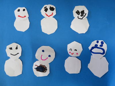 年少(たんぽぽ組)は、クリスマスリースの飾りにする雪だるまを作りました。子どもたちは、白紙をはさみを使って上手に丸く切り抜き、顔を書き入れて雪だるまを作りました。どの雪だるまもかわいらしい表情をしており、子どもたちの優しい気持ちがよく表れています。