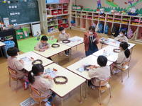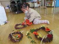 年長(ちゅうりっぷ組)は、クリスマスリース作りを始めました。クリスマスリースの土台となるリースは、本園で子どもたちが栽培したサツマイモのつるを利用して自分たちで作ったものを使用しました。本日の活動では、銀紙にマジックで着色してティッシュを包んで飾りにするボールを作り、リースの周りにリボンを巻きました。どのようなリースができるか楽しみですね!