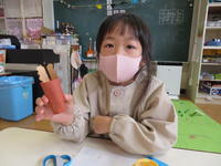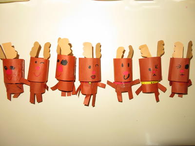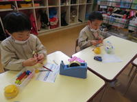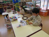 年長(ちゅうりっぷ組)は、クリスマスリースに飾るトナカイの人形を作りました。子どもたちは、上手に色画用紙を丸めて貼ったり、トナカイの角をハサミを使って切り抜いたり、マジックで目や鼻、口を描き入れたりしました。たいへんかわらしい人形ができました。