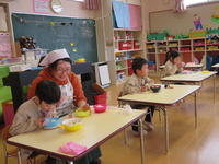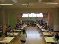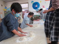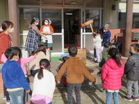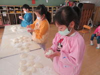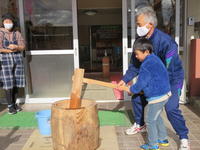コロナウイルス感染防止対策を十分に行い、PTA役員のお母さん方にご協力をいただき、餅つき会を開催しました。子どもたちは、園長から餅つきの由来について話を聞いた後、一人一人が餅つきを体験しました。重たい杵を持ち上げ、上手に臼に振り下ろし、その度にペッタンという大きな音が響きました。つき上がった餅は、子どもたちそれぞれに丸目餅にして、二段の鏡餅を作りました。また、機械でついた餅は、お母さん方がきな粉餅としる餅に料理していただき、全員で美味しくいただきました。何回もおかわりする子もおり、心もお腹もいっぱいの楽しい餅つき会でした。ご協力いただきました役員の皆様方に感謝申し上げます。