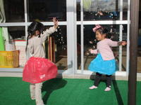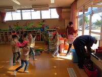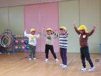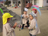 年少(たんぽぽ組)は、好きな遊びを楽しみました。男の子は、今はやりの鬼滅の刃ごっこのキャラクターになりきり、園庭を所狭しと駆けずり回っていました。女の子は同じ鬼滅の刃の曲に合わせてダンスを楽しんでいました。自分でカチューシャやスカートを身に着け、振り付けも自分たちで考えていました。