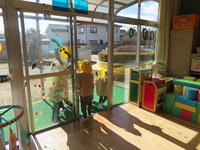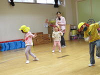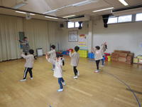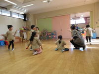 年少(たんぽぽ組)は、遊戯室でしっぽ取りで楽しく遊びました。子どもたちは、しっぽの付いたいろいろな動物になりきって保育室から遊戯室に移動し、曲に合わせて体を動かし調子を整えました。担任からしっぽ取りの約束事などの説明を聞いた後、子どもたちを追いかけました。子どもたちは、取られまいと奇声を発しながら必死に逃げ回って楽しんでいました。
