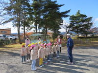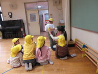 今年度5回目の避難訓練を行いました。今回は福島市で震度5の地震発生、その後、年長保育室のエアコンの器具から火災が発生したこを想定し行いました。11月22日(日)に福島市で震度4の地震が発生したこともあり、子どもたちは真剣そのもの、避難の合言葉「おはしもち」を守って迅速に避難することができました。併せて職員の119番通報等の訓練も行い、非常時に対応について確認しました。