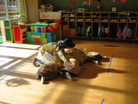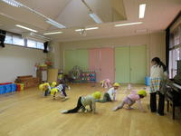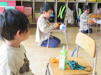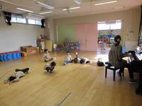年長(ちゅうりっぷ組)は、昆虫の表現遊びをしました。昆虫体操をした後子どもたちは、ピアノに合わせ、カマキリやバッタ、ダンゴムシなどになりきって動き、虫を狙う動作をしたり、餌を食べる動作をしたりするなど、先生の作ったお話しの内容をよく聞いて表現遊びをしました。それぞれに体全体を使ってそれぞれの昆虫を表現し、体を動かす楽しさや表現する楽しさを十分に味わっていました。
