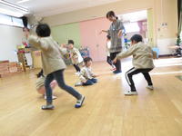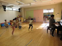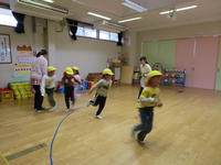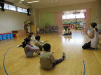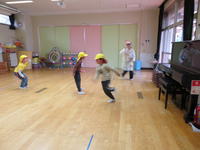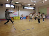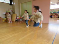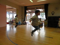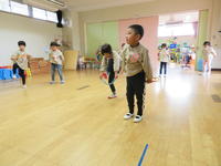 年長(ちゅうりっぷ組)は、今年度初めて縄跳びで遊びをしました。子どもたちは、縄を二重にして両手に持って足をくぐしたり、回したりし、慣れるにしたがい、本格的な連続跳びを行いました。また、長縄跳びを一人で跳んだり、みんなで跳んだりして楽しみました。今後は継続して縄跳びを行い、いろいろな技に挑戦していきます。