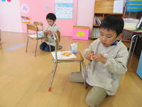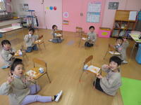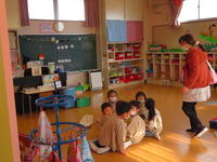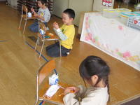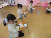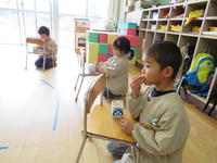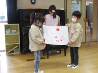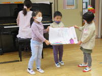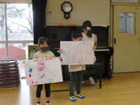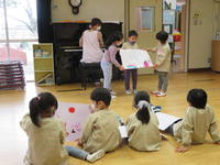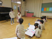 年長(ちゅうりっぷ組)は、3つのグループに分かれ、2週間にわたって歌「どんぐりころころ」の続きを考えて作る活動を行ってきました。ようやく完成したので、先生のピアノに合わせて歌を披露しました。子どもたちは、「どんぐりが池から足を滑らせて落ちた・・・」、「魚の階段を昇ったらかっこいい家があった・・・」、「亀が出てきて背中に乗せた・・・」など想像を膨らませて歌を作り文字や絵で表現しました。発表後は、それぞれの良かったとこころの感想を述べました。幼稚園生としては、かなりレベルの高い活動でしたが、それぞれによくできました。