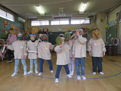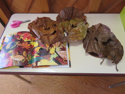 子どもたちは、大喜び、絵本と比較しながら葉っぱを見たり、お面や頭の飾りを作ってみんなで比べあったりして遊びました。