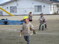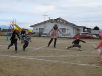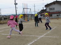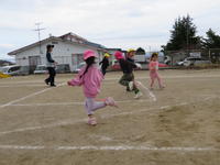 年少(たんぽぽ組)は、園庭でしっぽ取りで楽しく遊びました。子どもたちは、担任からルールや方法等について説明を受けた後、はじめは教師が鬼になってしっぽを取られないように逃げたり、取られた場合には予備のしっぽをつけて再度参加するなどやり方を理解しました。いよいよ子どもが鬼になってしっぽ取りを行いますと、しっぽを取る子も逃げる子も本気になってコートを所狭しと駆けずり回っていました。外は少し肌寒かったのですが、子どもたちは全身が火照り顔を真っ赤にしていました。