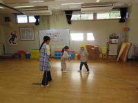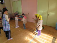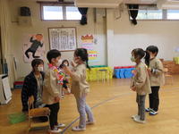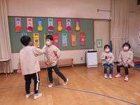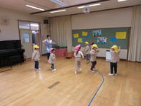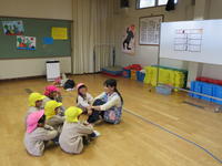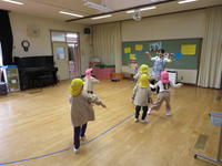 年少(たんぽぽ組)は、遊戯室でドンジャンケンをして遊びました。子どもたちは保育室から、くまやうさぎ、かえるになって遊戯室に移動し、ダンス「きのこ」を踊りました。その後、ドンジャンケンについて教師の話を聞き、ゲームを行いました。どのようにしたら勝てるかをチームで作戦を考え楽しんで行っていました。
