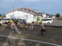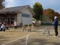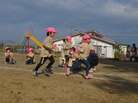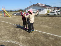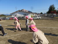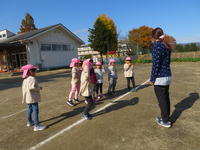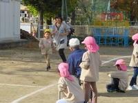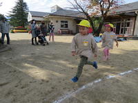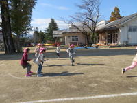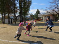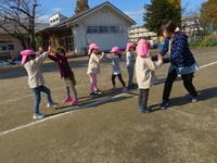 年長(ちゅうりっぷ組)は、鬼遊びのひとつであるレンジでチンで遊びました。この遊びは、鬼に捕まらないように逃げ回り、捕まった場合にはその場で固まって動けなくなります。そして、助けてもらうためには、仲間二人に囲んでもらい「レンジでチン」と唱えてもうらうと解凍し動けるようになるといルールの鬼遊びです。子どもたちは、青空のもと元気よく動き回っていました。
