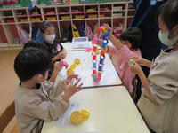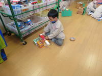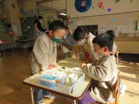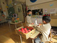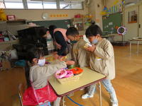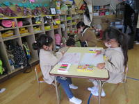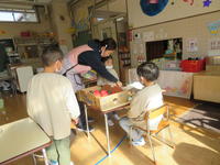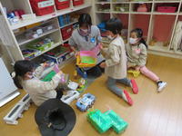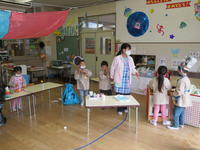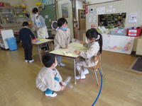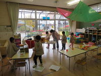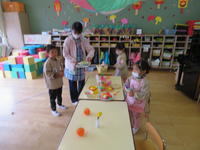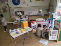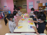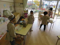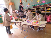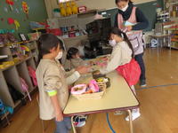 年少(たんぽぽ組)は、お店屋さんごっこで楽しく遊びました。子どもたちは、綿あめ屋さん、寿司屋さん、ケーキ屋さん、果物屋さんなどのお店を設営し、店主になって呼び込みをしたり、品物を売ったり、また、お客になって買い物を楽しんだりしました。7人という少ない人数ですが、みんなで協力しそれぞれに役割を果たして楽しく遊びました。