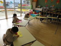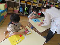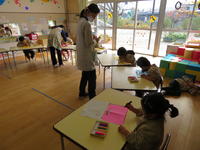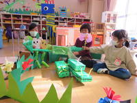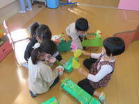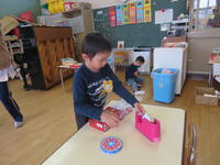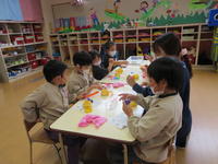 年少(たんぽぽ組)は、来年度入園を希望している子どもたちへのプレゼンとして、色画用紙で袋を作りました。子どもたちは、来年、弟や妹なる子どもたちのために心を込めて袋を作りました。袋は、11月11日(水)の入園選考に来た子どもたちへ贈ることにしています。