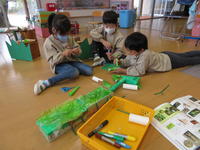 年長(ちゅうりっぷ組)は、昆虫作りに取り組んできましたが、ようやく出来上がりしました。子どもたちは、昆虫を飼育箱で飼って観察をしたり、図鑑で調べたり、絵を描いたりしてきましたので、バッタやカマキリなどの特徴をよく捉えた作品を作り上げました。昆虫作りが一段落したこともあり、これまで飼っていた昆虫を自然に返し別れを告げました。