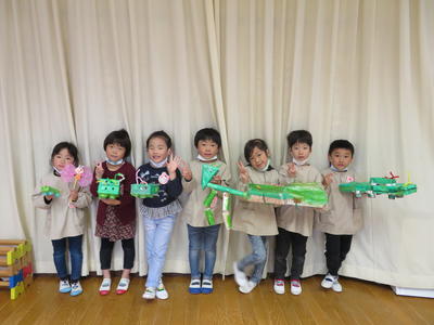 ミニランRUNフェスティバルが天候の関係で中止となり、子どもたちは保育室でそれぞれに絵を描いたり、空き箱や紙などでおもちゃやバッタ、チョウなど昆虫を作ったり、ペットボトルの楽器で演奏したりと思い思いの遊びで楽しみました。