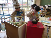 年少(たんぽぽ組)は、カフェごっこ遊びで楽しみました。子どもたちは、テーブルや椅子、ビニールシートなどを利用してカフェのお店を作り、それぞれに調理をしたり、食器を洗ったり、飲み物を作ったり、ケーキやパフェを準備したりするなどの役割を一生懸命に行い、楽しみました。