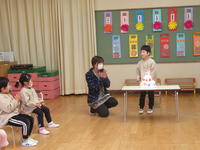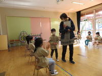 年長(ちゅうりっぷ組)、年少(たんぽぽ組)全員で、11月生まれのお友達の誕生会を開催し、お祝いしました。誕生児がみんなの拍手の中を入場して会が始まり、誕生児の紹介、インタビュー、うた「おめでとう」、学級のお友達の手作りのプレゼント贈呈がありました。誕生児は、みんなから祝福され満面の微笑みを浮かべていました。