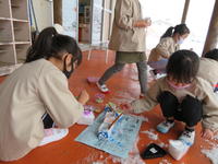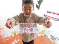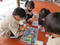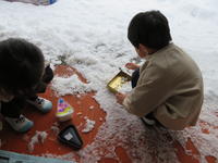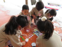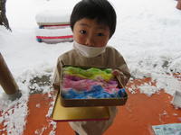 年長(ちゅうりっぷ組)は、雪をケーキの容器やプリンカップなどの好きな入れ物に入れて、アイスケーキやかき氷を作りました。5色の絵の具を筆で雪に色付けして、ブルーハワイ味やいちご味のかき氷を作ったり、様々な色を付けてフルーツケーキを作ったりするなど、思い思いにイメージを形にしながら遊んでいました。時間が経って雪全体に染み込んだケーキ等を見て「雪なのに、おいしそう!」と話す子どもたちでした。