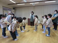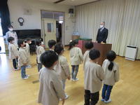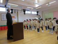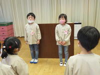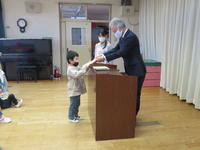 終業式では、園長の話の後に、年長(ちゅうりっぷ組)、年少(たんぽぽ組)の代表の子どもが頑張ったこと、思い出に残ったことを堂々と発表しました。また、園長から頑張った子どもたち一人一人に絵本の贈呈がありました。呼名に対して大きな返事をし、背筋を伸ばし、礼をきちんとして絵本を受け取っていました。最後には、年長と年少が向かい合って、年少が年長にお世話になったお礼を述べ全てを終了しました。