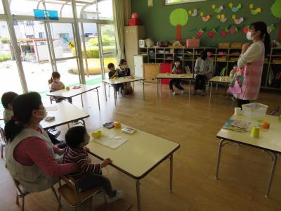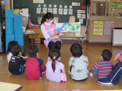 はじめにカエルの出てくるお話を読み聞かせしました。園児たちはよい姿勢で聞き入っていました。