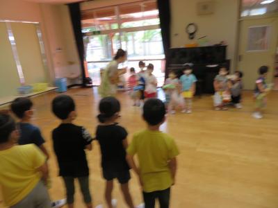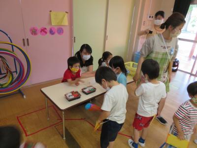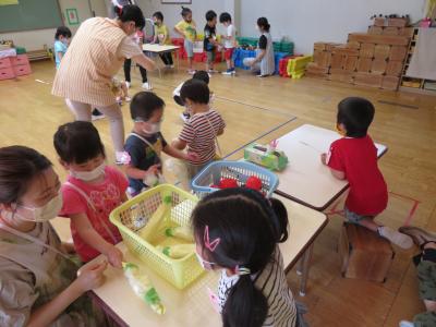 2021年6月10日 10時56分ちゅうりっぷ組さんのみんなで力を合わせて準備してきたお店屋さん、今日はたんぽぽ組さんを招待していよいよ開店です。