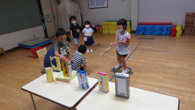 夏祭りの準備も 2021年7月5日 10時14分 盆踊りの練習が終わってから、「射的」「ボーリング」「的あて」の3つのグループに分かれて、それぞれで準備作業を行いました。 みんなでいろいろアイディアを出し合いながら、楽しく進めることができました。