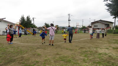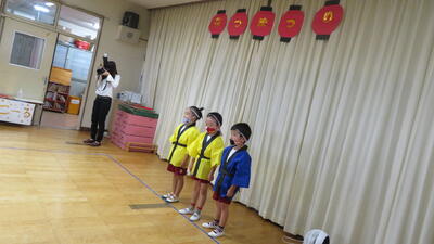 年少組さんの初めのことばでスタートし、まずはみんなで盆踊りです。外でできたので、間隔を十分にとって楽しく踊りました。