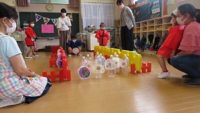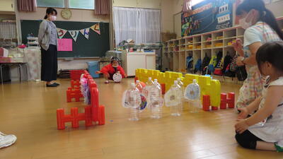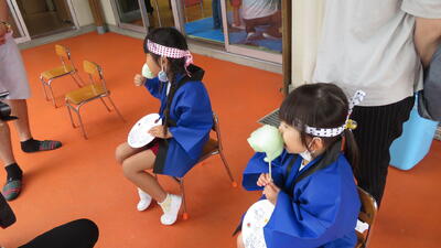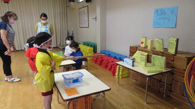 みんなで準備してきた「ボーリング」「的あて」「射的」の3箇所に、綿あめのコーナーを、親子で一緒に回りました。半分がお客様、半分がお店屋さんということで、前半後半に分けて全員がすべてを回って楽しむことがでいました。夏祭りが終わると、もうすぐ梅雨明けし夏休み、夏本番の暑さがやってきます。