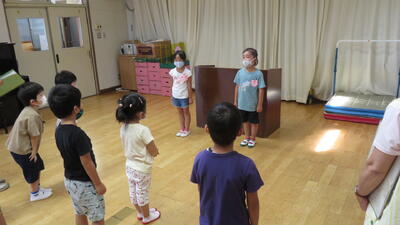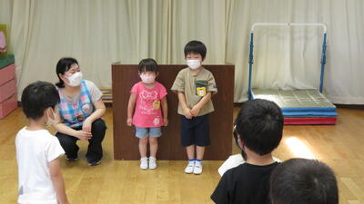 次に、年長さん年少さんから2名ずつ前に出て「1学期楽しかったこと」を発表しました。堂々とした態度で発表していました。