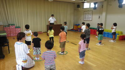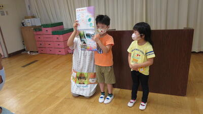 次に、ちゅうりっぷ組、たんぽぽ組さんから2名ずつ前に出て夏休みの思い出をお話ししてくれました。
