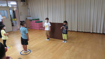 さっそく遊戯室で始業式を行いました。感染状況がよくないため、一人一人の間隔をこれまで以上にとっての式としました。