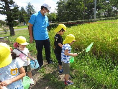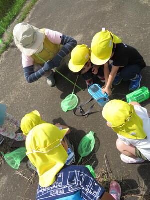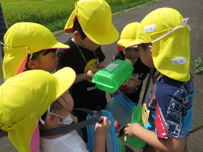天気の良い中、たんぽぽ組さんは、田んぼの方へ行って虫探しをしました。