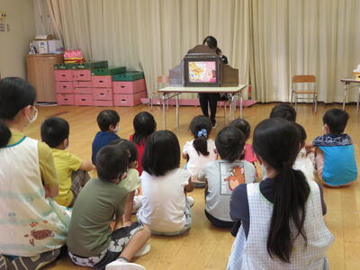 お月見会では、紙芝居をみんなでみました。お月見にどうして団子をそなえるのかがわかりました。