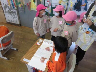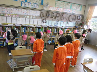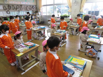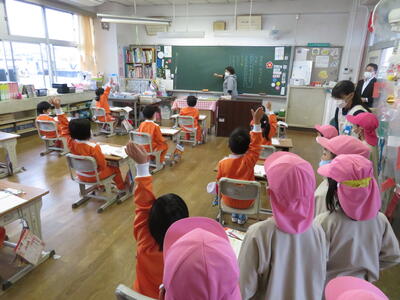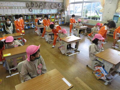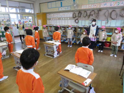 初めに1年生教室へ入って、挨拶をし、授業の様子を見学しました。国語の授業でした。園児たちは興味津々で教室を見渡したり、授業の様子を見学したりしました。