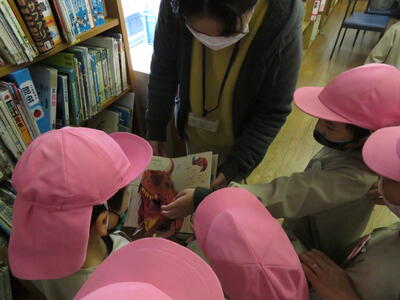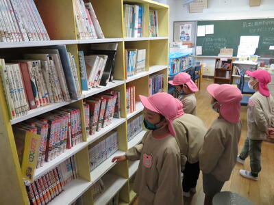 最初は図書室です。たくさんの本があって驚いていました。図書館司書の先生に飛び出す絵本を見せていただきました。
