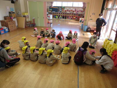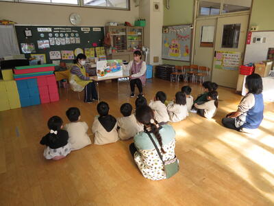 庭塚幼稚園との交流を行いました 2021年11月22日 16時05分 庭塚幼稚園の園児たちら来園し、交流保育を行いました。 ちゅうりっぷ組、たんぽぽ組各々の保育室や遊戯室、園庭を使って楽しい交流を行うことができました。