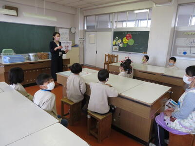 はじめに、西部学校給食センターの栄養士さんから、給食についてのお話を聞きました。園児たちは真剣なまなざしで聞き入っていました。