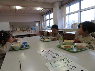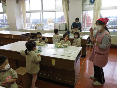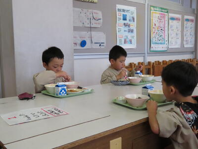 コロナ前は、1年生と一緒に食べていましたが、昨年度から幼稚園児だけで食べています。