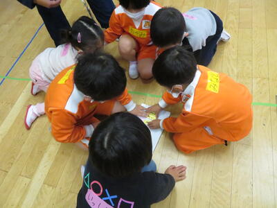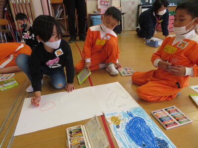 次は、これまで継続して行っていた絵のリレーです。今回は小学生と相談しながら一緒に描きました。幼稚園児は感想も発表しました。