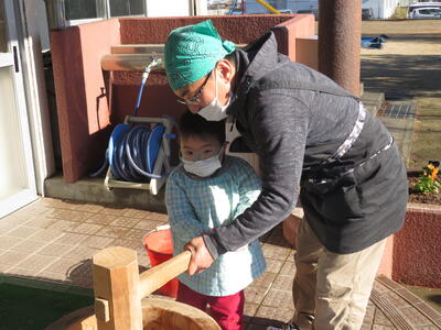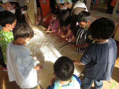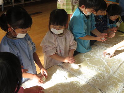 続いて、遊戯室に戻り、鏡餅づくりです。粉まみれになりながらも、頑張ってつくりました。乾燥したらお家に持ち帰ってもらいます。