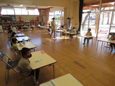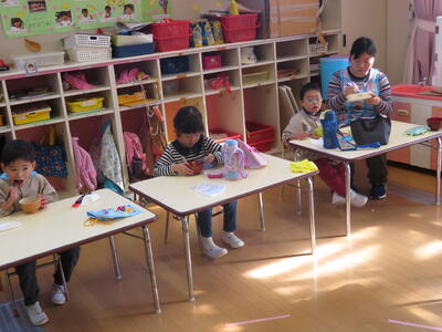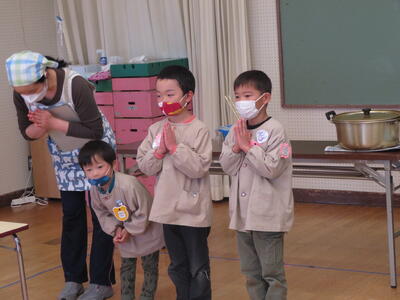 最後は待ちに待った会食です。園児の多くは何回もおかわりして、おなか一杯汁餅ときな粉餅を食べました。