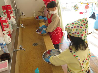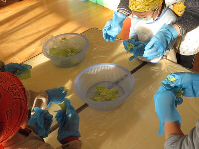 たんぽぽ組さんは、米とぎと、レタス切りをしました。みんなかわいらしいエプロンを着て、ばんがりました。