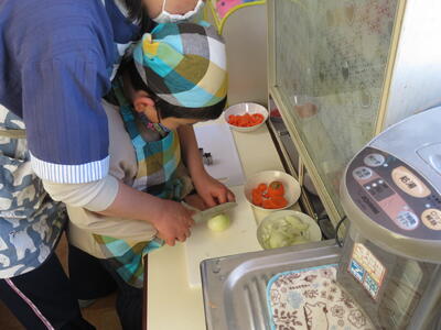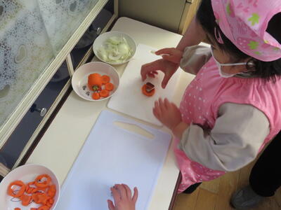ちゅうりっぷ組さんは、カレーで使う玉ねぎとニンジンを切りました。ニンジンは星とハートの形にします。