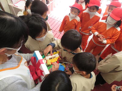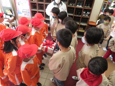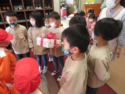 2021年12月22日 10時21分佐倉小学校の1年生がプレゼントをもって幼稚園に来てくれました。1年生が折った折り紙を、箱いっぱいに入れて届けてくれたのです。