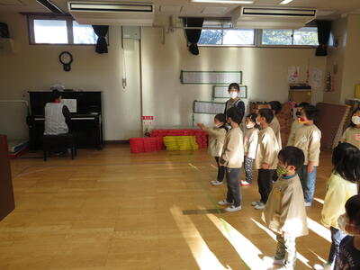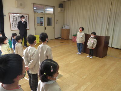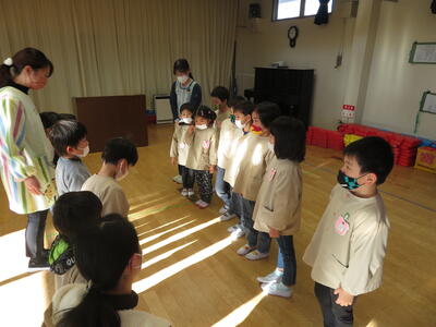 式が終わって、年少さんから年長さんに「2学期たくさん遊んでくれてありがとうございました」とお礼を言いました。そして、「よいお年を」と互いに挨拶しました。