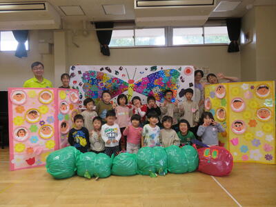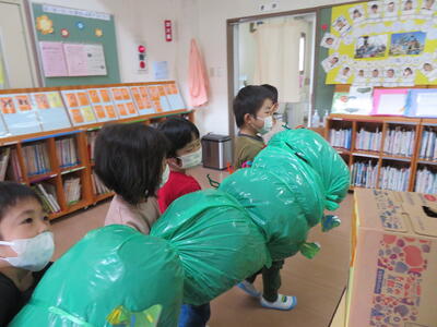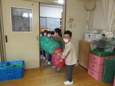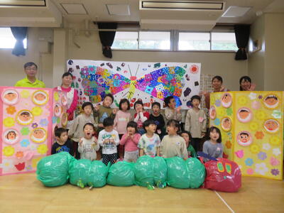 文化祭に出品していた「はらぺこあおむし」が幼稚園に戻ってきました。みんなで遊戯室へ運びました。