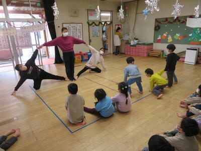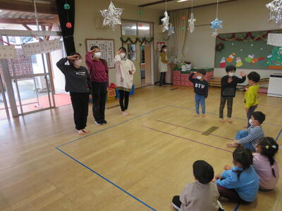 最初に先生の探検隊です。「かっこいー」と声がかかりました。先生方も顔を真っ赤にしながら頑張りました。