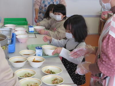 今回は、配膳から挑戦。年長さんは献立の全てを自分でもらいます。